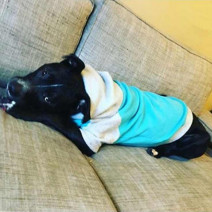 Odie had a skin condition since he was first adopted by Lennie, and because of this he needed to wear a jacket to keep him warm. He came to feel safer in his hoodie.
