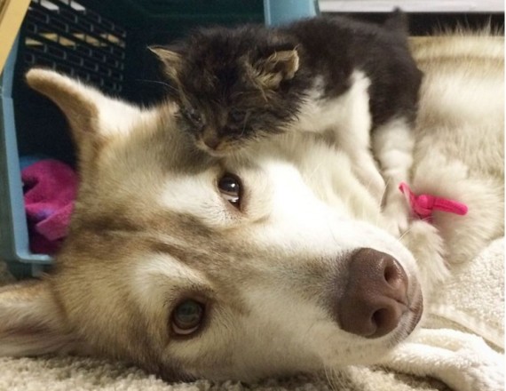 Lilo is a Husky that treats the kitten like her own. The kitten started eating only hours after cuddling Lilo!