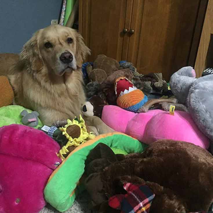 “She does it when she has to go to bed early with me, almost like she needs a toy to keep her entertained,” her owner, Kim Downie, said. “She is very specific about what she chooses to take to bed. She will search the house and empty her toy boxes until she finds whatever one she is looking for.”