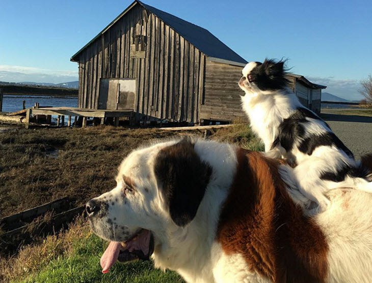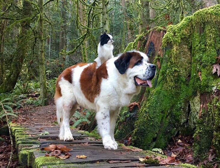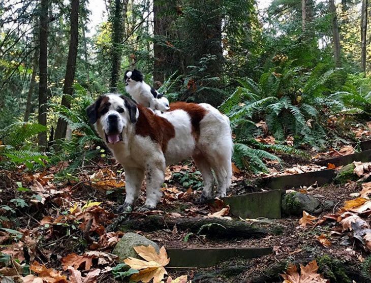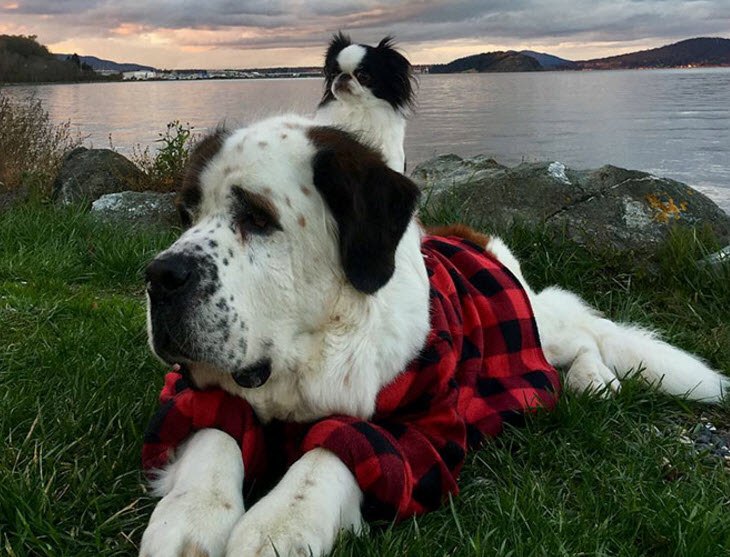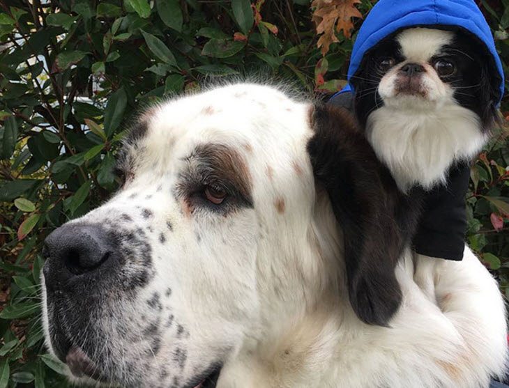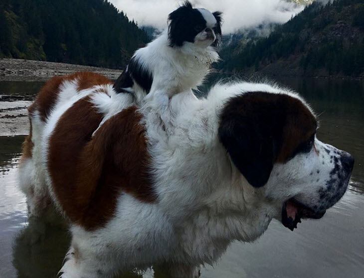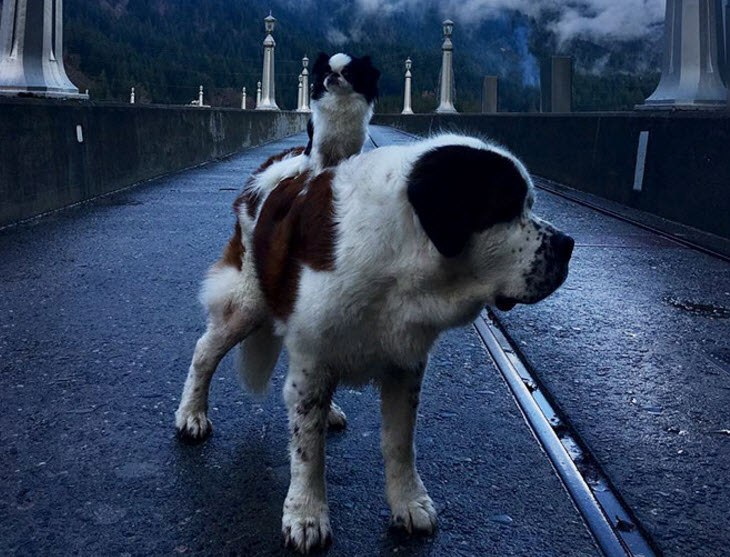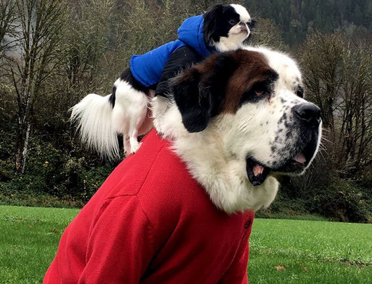 Why walk when you can ride? That is apparently the thought process of Lulu, a tiny dog that weighs less than 5 pounds. Blizzard, who resides in the same household as Lulu weighs 126 pounds, and is a very happy and tolerant Saint Bernard.