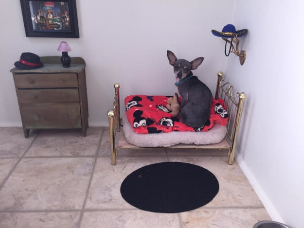 He realized the miniature room — outfitted with miniature funiture and miniature decor — was made for Poncho. Yes, the dog.