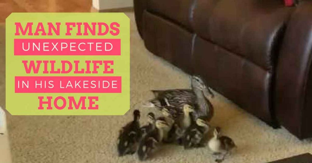 From the dining room, the ducks spot the open sliding glass door, so they decide to head to the sunny backyard. They hop down into the grass and make their way to the edge of James’ property where you can see the lake in the distance. When they reach the fence, the duckling easily pop through a hole, but mama duck has a hard time finding a way through. In the video, you can hear her moment of panic while trying to figure out how to get through the fence to her babies.